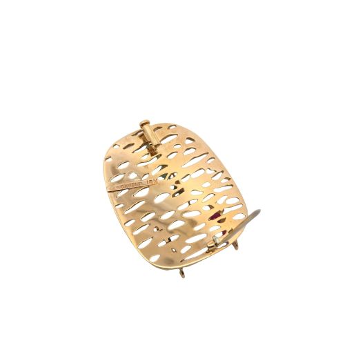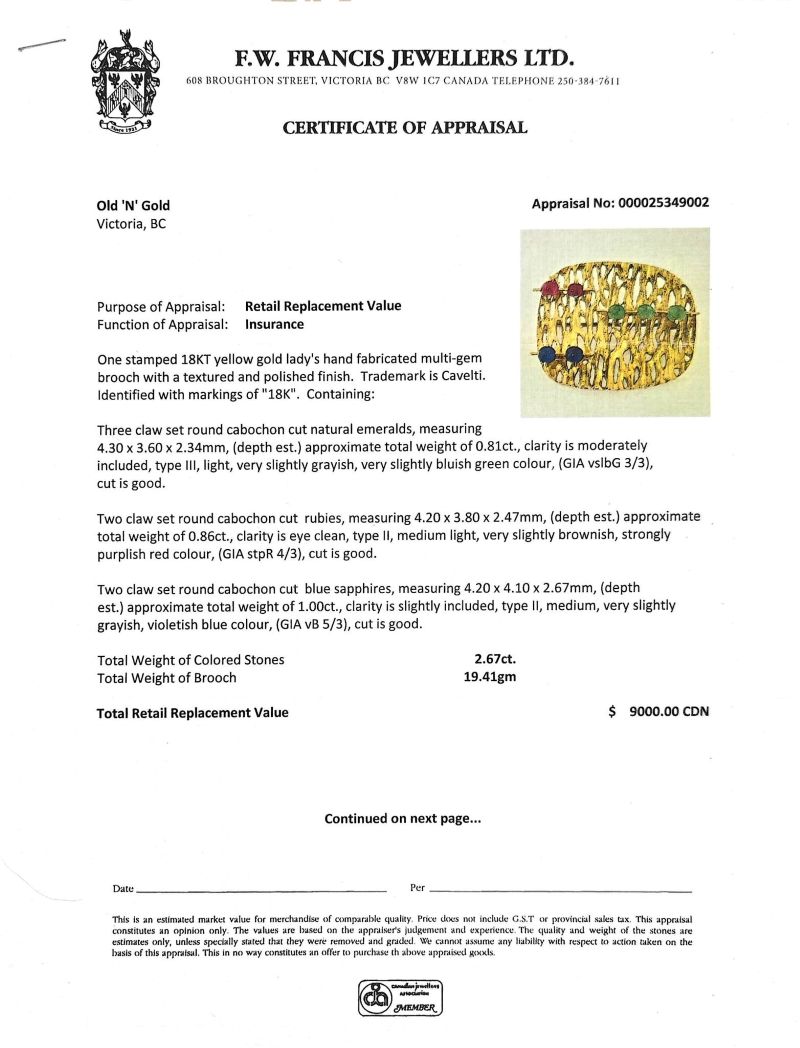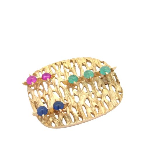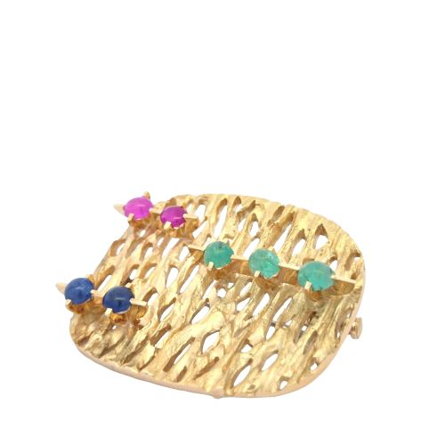 18K Yellow Gold Cavelti Brooch w/ Cabochon Emerald, Ruby & Sapphire