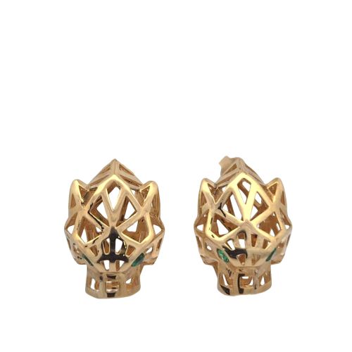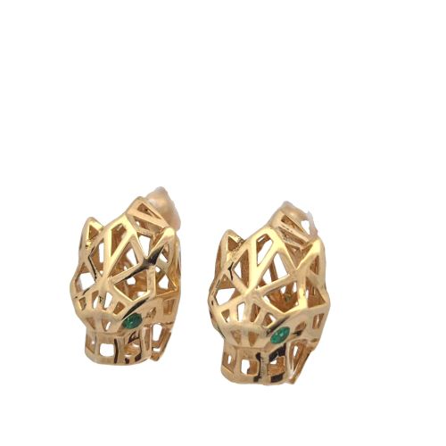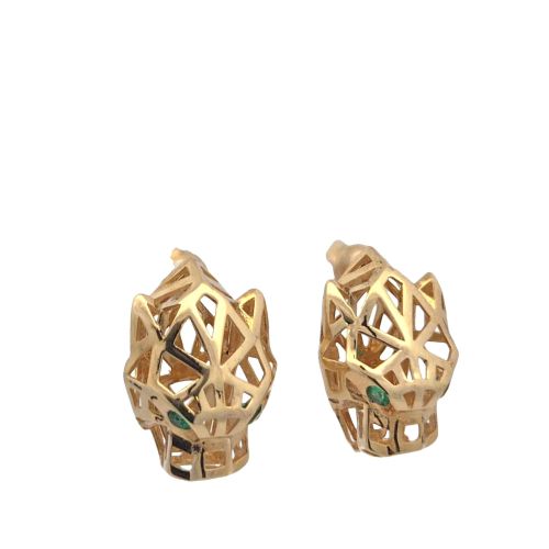 Pair of 18K Yellow Gold Panther Head Emerald Eye Stud Earrings